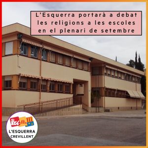 El Grup Municipal de L’Esquerra ha presentat per registre una moció per al plenari del dilluns que ve corresponent al mes de setembre. En aquesta la formació d’esquerres aborda la polèmica formada per la implementació de la religió evangèlica i islàmica en alguns dels centres públics valencians. En el cas de Crevillent en tres d’ells, el Párroco Francisco Mas, Miguel Hernández i Mas Magro. Des de la coalició afirmen que el Partit Popular està fent una campanya de la por amb un tema en què són els primers que haurien de callar, ja que va ser el Partit Popular i el govern de Mariano Rajoy qui en 2016 va impulsar i detallar els plans d’estudis de l’assignatura de religió islàmica. Una assignatura que ja s’imparteix en les altres autonomies a excepció de tres que acabaran per fer-ho l’any vinent.