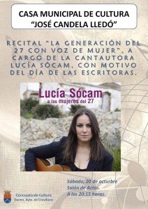 Crevillent (19/10/2018).- El salón de actos de la Casa Municipal de Cultura “José Candela Lledó” acoge mañana sábado 20 de octubre, el recital “La generación del 27 con voz de mujer” a cargo de la cantautora, guitarrista y flautista española Lucia Sócam, con motivo de la celebración del Día de las Escritoras.