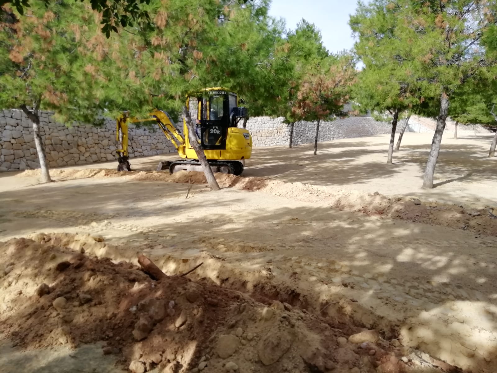 Según el concejal de jardines, Francisco Verdú, los trabajos han empezado este lunes con una nueva instalación de riego por goteo para los árboles existentes. En este sentido el primer trabajo que se está realizando son   las zanjas para instalar  los tubos y cubrirlo con arena.