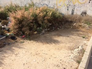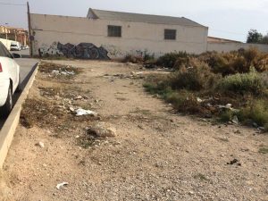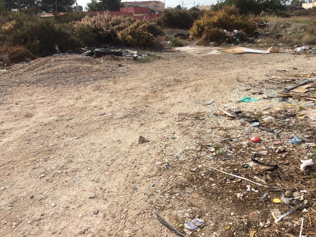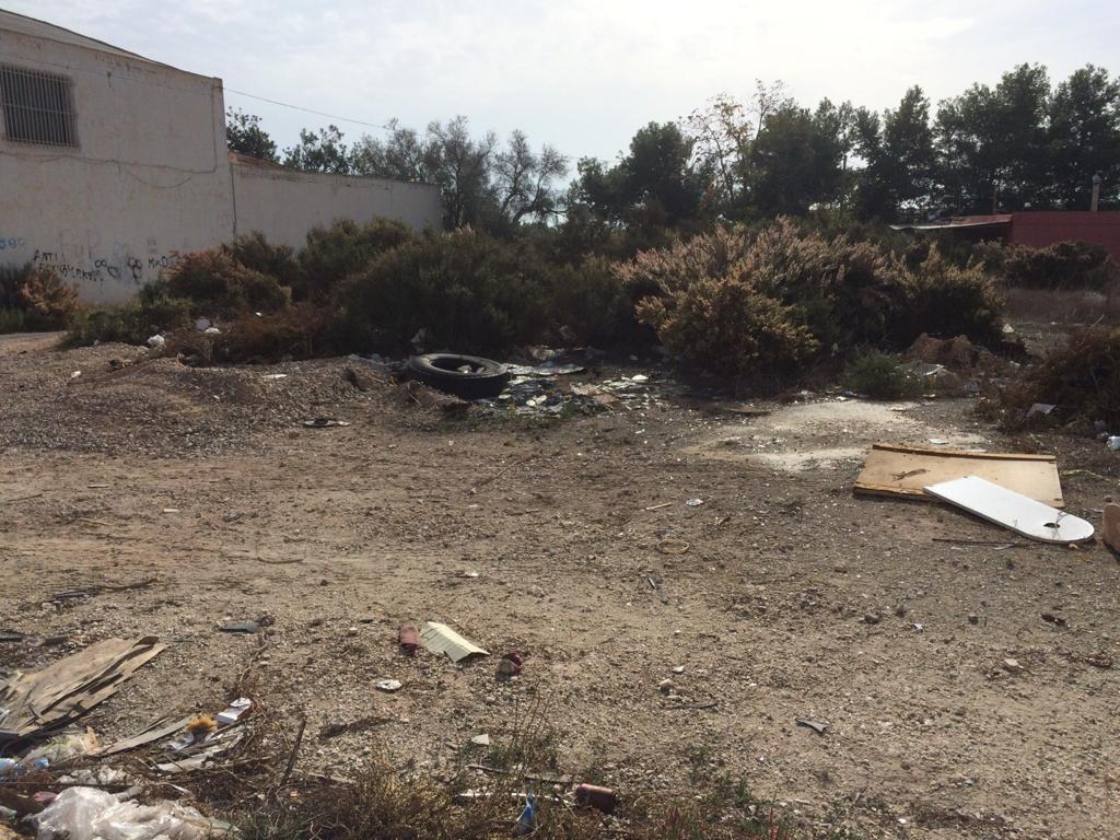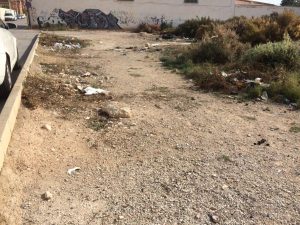 solars enfront del col·legi Julio Quesada on s’acumula la brutícia sense que hi haja cap actuació de neteja. Aquesta acumulació de brutícia i l’absència de voreres fa perillós el trànsit especialment de menors. Compromís sol·licita que s’actue per l’Ajuntament i en tot cas que s’inste als propietaris a la neteja de la zona davant l’acumulació de pneumàtics ,botelles trencades, llandes , plàstics i tot tipus de brutícia.