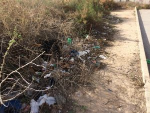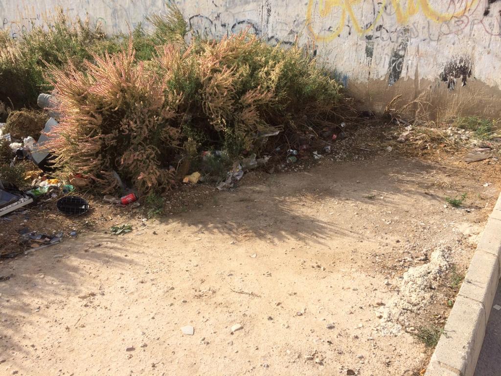 colegio Julio Quesada donde se acumula la suciedad sin que haya ninguna actuación de limpieza. Esta acumulación de suciedad y la ausencia de aceras hace peligroso el tránsito especialmente de menores. Compromís solicita que se actúe por el Ayuntamiento y en todo caso que se inste a los propietarios a la limpieza de la zona ante la acumulación de neumáticos , botellas rotas, latas ,plásticos y todo tipo de suciedad.