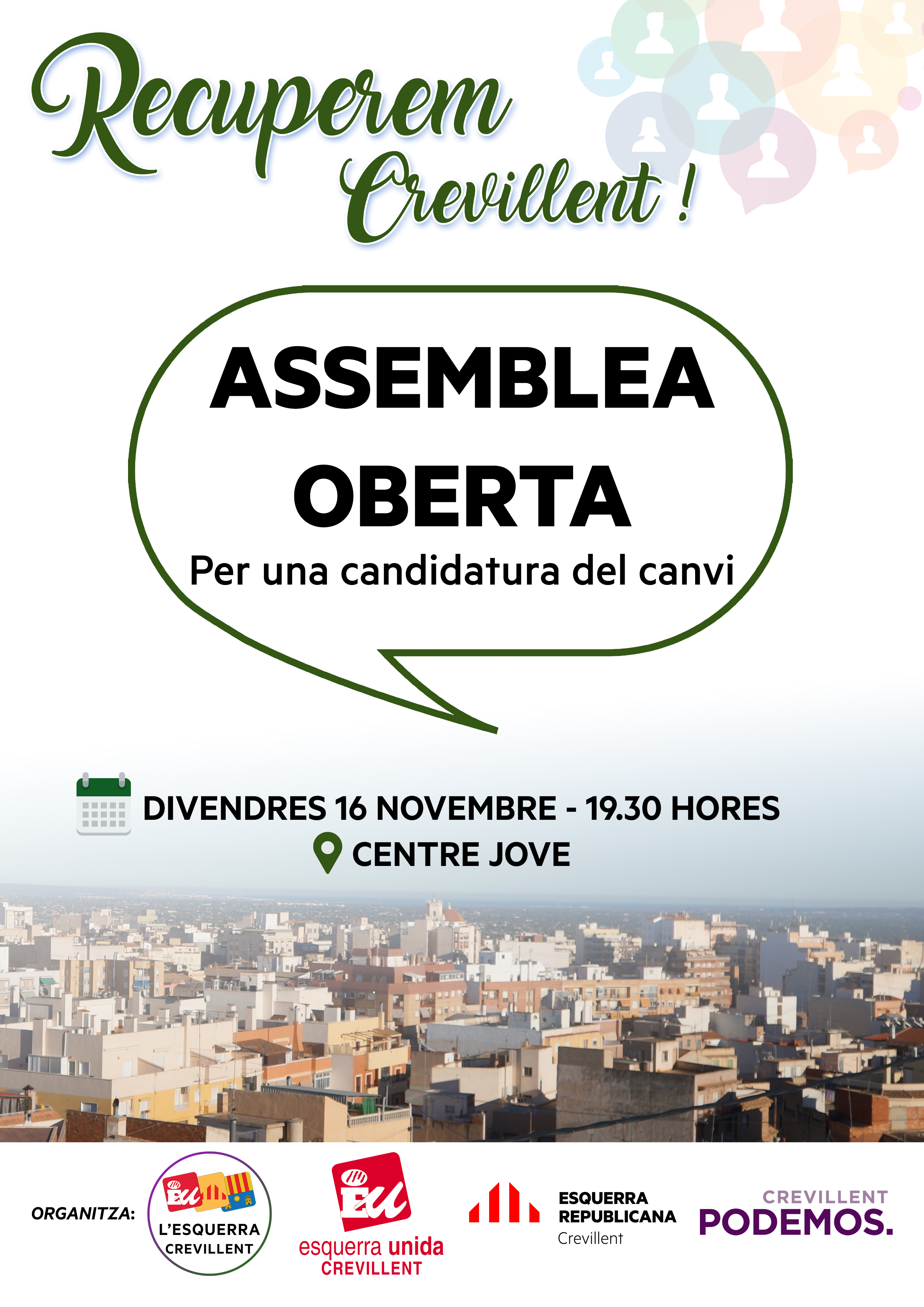 Este divendres 16 de novembre està convocada una assemblea oberta en el Centre Jove per part de les formacions progressistes de Crevillent on es parlarà del camí que s’ha de seguir de cara a les eleccions municipals de 2019. Esta convocatòria compta amb el suport del Grup Municipal de L’Esquerra de Crevillent així com les formacions polítiques d’Esquerra Unida, Esquerra Republicana i Podemos Crevillent.