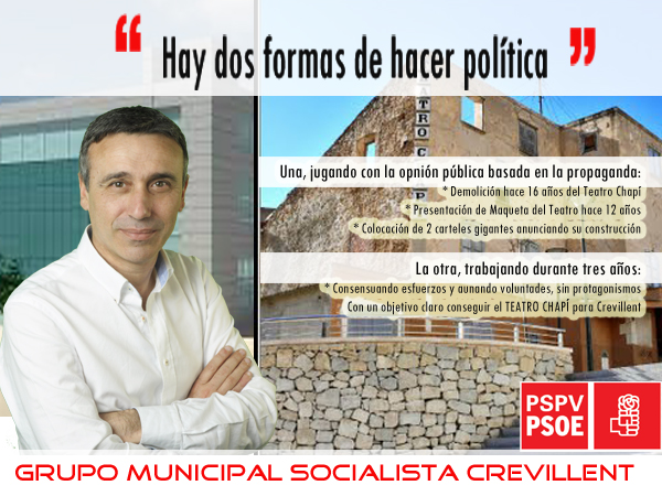 Todos estos años han mostrado que hay dos formas de hacer, una jugando con la opinión pública basada en la propaganda, basta recordar hechos como la demolición hace 16 años del Teatro Chapí, la presentación de la maqueta del Teatro ante los crevillentinos (hace ahora la friolera de 12 años) o la colocación de 2 carteles gigantes anunciando su construcción.