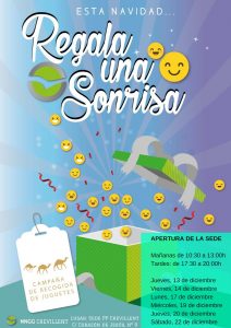 Los días que se podrán donar juguetes y comida son el 13, 14, 17, 19 (sólo tarde) y 20 de diciembre. El día 22 de diciembre a las 19:30 será la entrega de juguetes a las asociaciones. El horario de apertura de la sede situada en C/ Corazón de Jesús número 9,  será en turno de mañana de 10:30 a 13:00h y tardes: de 17:30 a 20:00h.