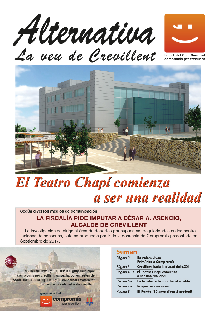 En esta Revista el contenido central es la licitación del proyecto del Teatro Chapí que la Conselleria de Educación, Cultura y Deportes de Vicent Marzà ya ha publicado con fecha de 1 de diciembre del presente año. Esta noticia destacada supone el cumplimiento de las promesas de la Conselleria con los crevillentinos, realizado ante el Consell Rector del Ateneo Municipal de Cultura, de desbloquear el proyecto del Teatro, que el PP fue incapaz de realizar, y que con este inicio de licitación empieza la cuenta atrás para que por fin Crevillent disponga de su ansiado Teatro.