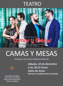 Crevillent (21/12/2018).- La VIII edición de la Muestra de Teatro de Crevillent continúa este sábado 22 de diciembre, en la Casa Municipal de Cultura “José Candela Lledó, con la representación de la obra “Camas y mesas”, una comedia muy poco romántica de Emilio Williams, a cargo de la compañía Melpómene Dacria Teatro y dirigida por Olga Mínguez Pastor.