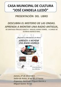 Crevillent (26/12/2018).- El libro de Santiago Íñiguez García y Miguel Gomis Terrés “Descubra el misterio de las ondas. Aprenda a montar una radio antigua” será presentado este jueves, 27 de diciembre, a las 20.00 horas en el salón de actos de la Casa Municipal de Cultura “José Candela Lledó”. El ejemplar será presentado por el periodista crevillentino, Octavio Asencio Mas, que actualmente trabaja en Radio Nacional de España.