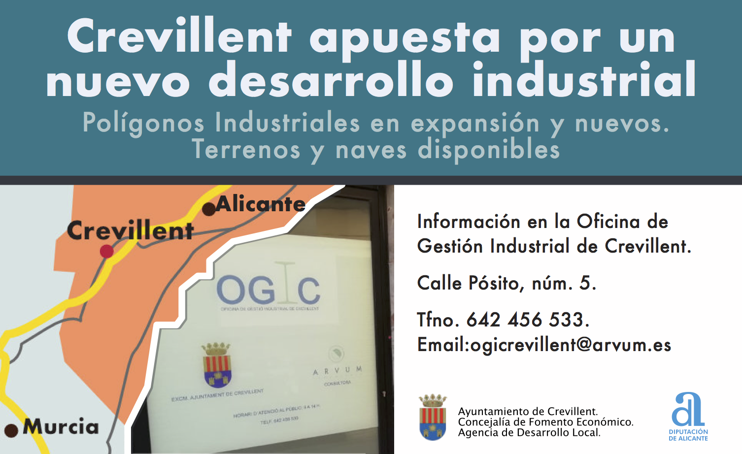 Crevillent (16/01/2019).- La Oficina de Gestión Industrial de Crevillent (OGIC) que ha impulsado la Agencia de Desarrollo Local , ha organizado para el próximo 22 de enero una jornada sobre ayudas públicas para inversiones e innovación en Crevillent que tendrá lugar en el Centre Jove “Juan Antonio Cebrián”.