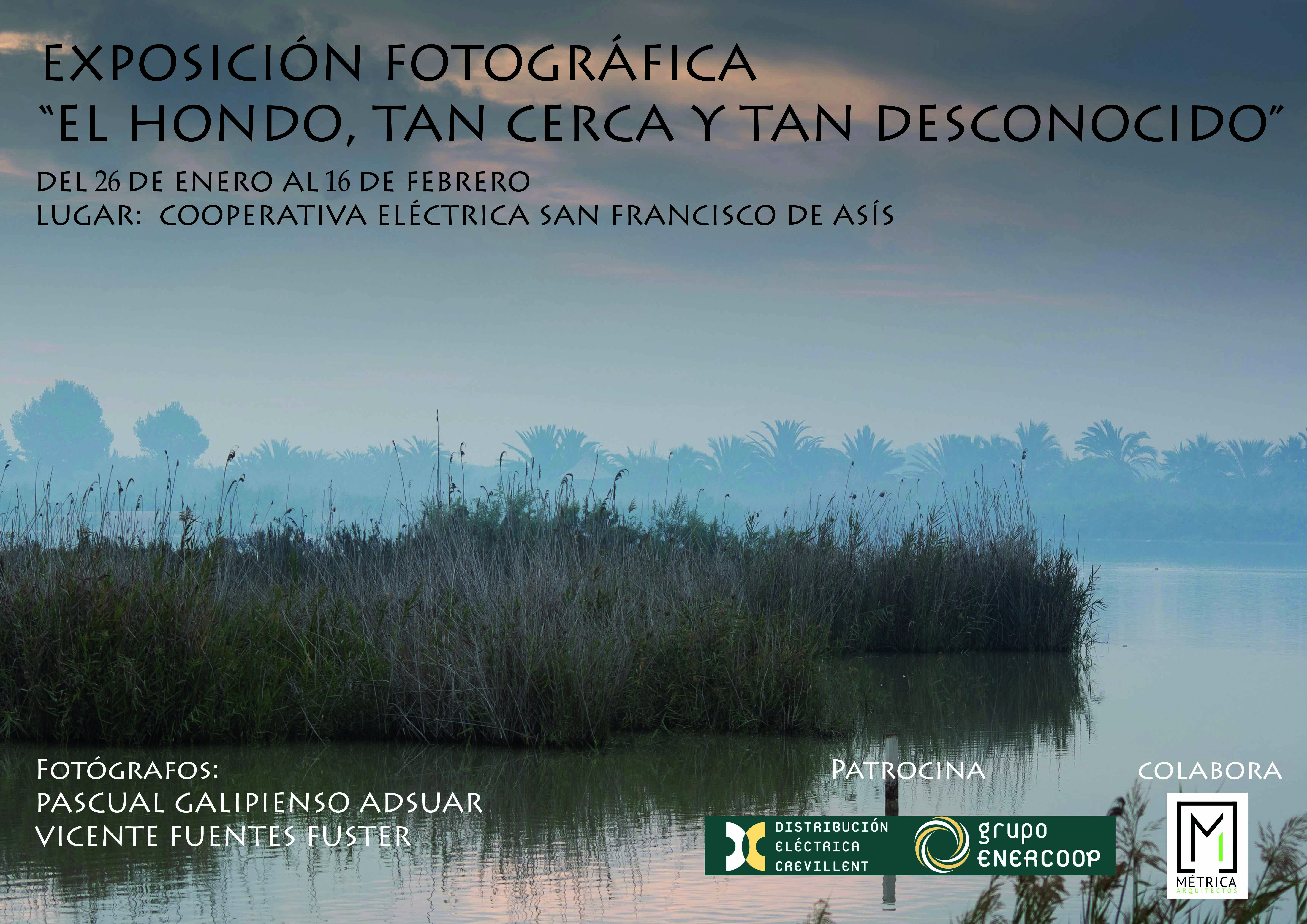 La Cooperativa Eléctrica de Crevillent acoge desde mañana sábado hasta el 16 de febrero una exposición fotográfica dedicada a El Hondo promovida por los fotógrafos crevillentinos Pascual Galipienso Adsuar y Vicente Fuentes Fuster. La muestra, con un centenar de instantáneas sobre la fauna y los distintos paisajes de este parque natural se inaugura este sábado a las 20.15 horas.