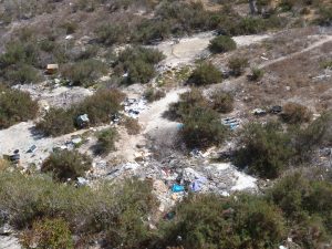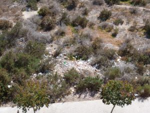 Me gustaría adjuntaros unas fotos sobre el estado en el que se encuentra. Además de la maleza creciente, cada vez se están acumulando más escombros, basura y enseres que la gente tira «ahí a la vuelta del matorral», «total desde la cera no se ve nada». Se está convirtiendo en un vertedero improvisado donde se despiezan las partes que se pueden vender en la chatarra y el resto se queda ahí, en suelo de nadie. Se ha convertido en el lugar donde arrojar los escombros de las obras, basura, etc. incluso hay un pequeño campamento donde debe ir algún sin techo, o a saber qué.