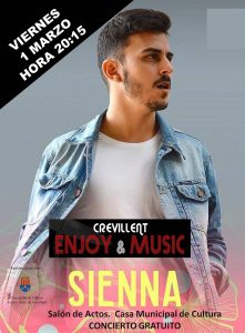 Crevillent (27/02/2019).- La Casa Municipal de Cultura “José Candela Lledó” celebra este viernes la segunda actuación del festival Crevillent Enjoy & Music, a cargo de Sienna. El concierto tendrá lugar este viernes 1 de marzo, a las 20.15h, en el salón de actos de la Casa Municipal de Cultura “José Candela Lledó” y servirá para dar comienzo a la celebración del Carnaval 2019.