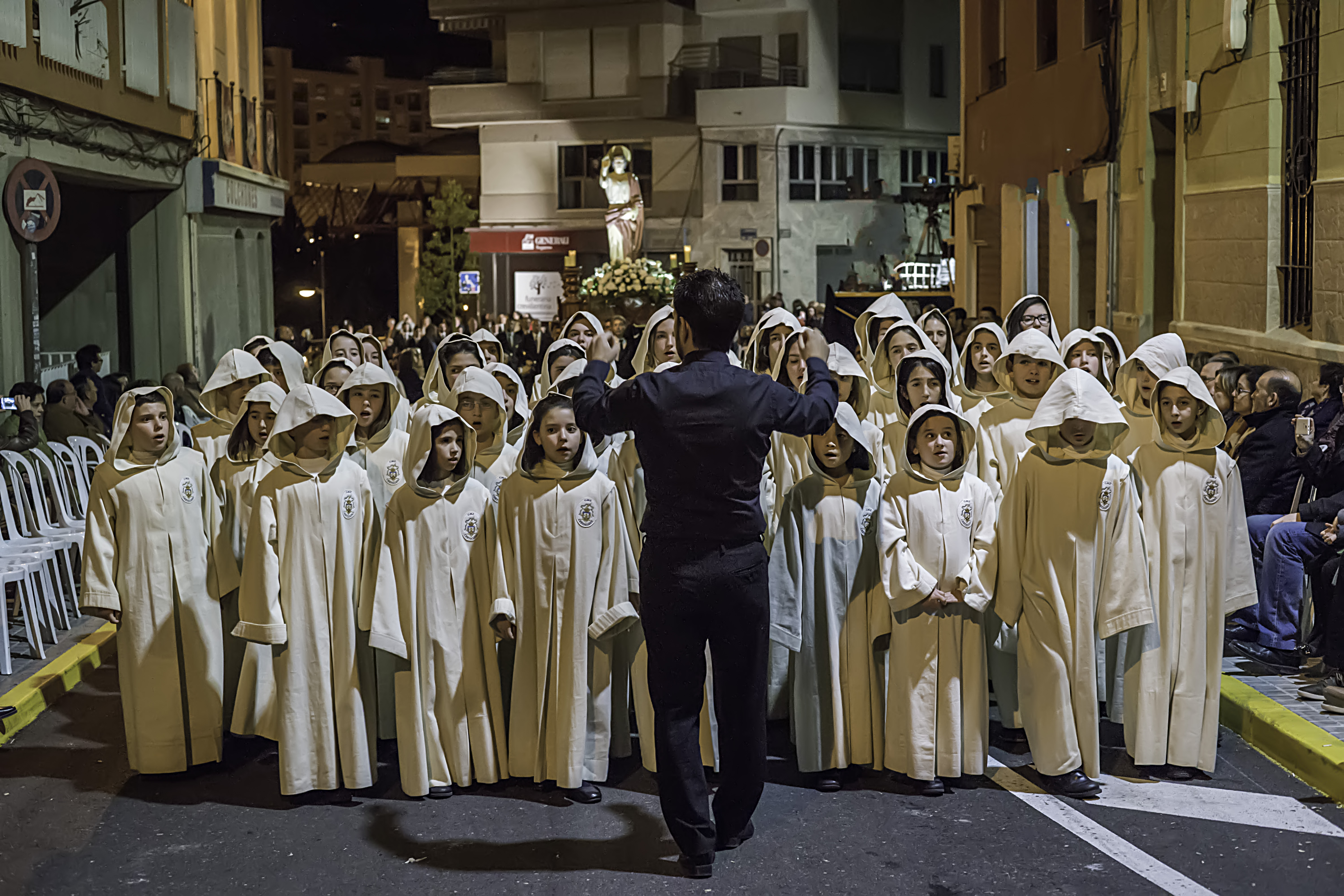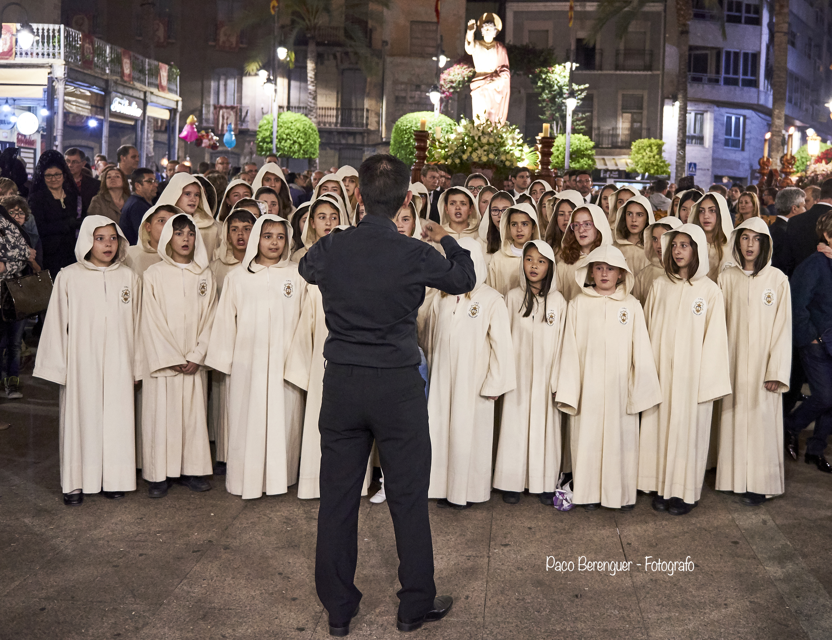 En 2009, el coro comienza su participación durante las procesiones del Viernes Santo, acompañando al Traslado del Santo Sepulcro, vestidos de hebreos y el Sábado Santo acompañan el paso de San Juan Evangelista, donde interpretan la pieza “San Juan Evangelista”, original del compositor crevillentino D. Ramón Mas Soler, siendo el único coro de voces blancas que participa en ambas procesiones, hasta el momento.