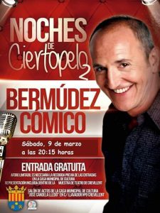 Crevillent (07/03/2019).- El salón de actos de la Casa Municipal de Cultura “José Candela Lledó” acoge este sábado, 9 de marzo, la actuación “Noche de Ciertopelo 2”, a cargo del cómico Bermúdez. El monólogo dará comienzo a las 20.15 horas y estará acompañado por la actuación del ilusionista Ximo.