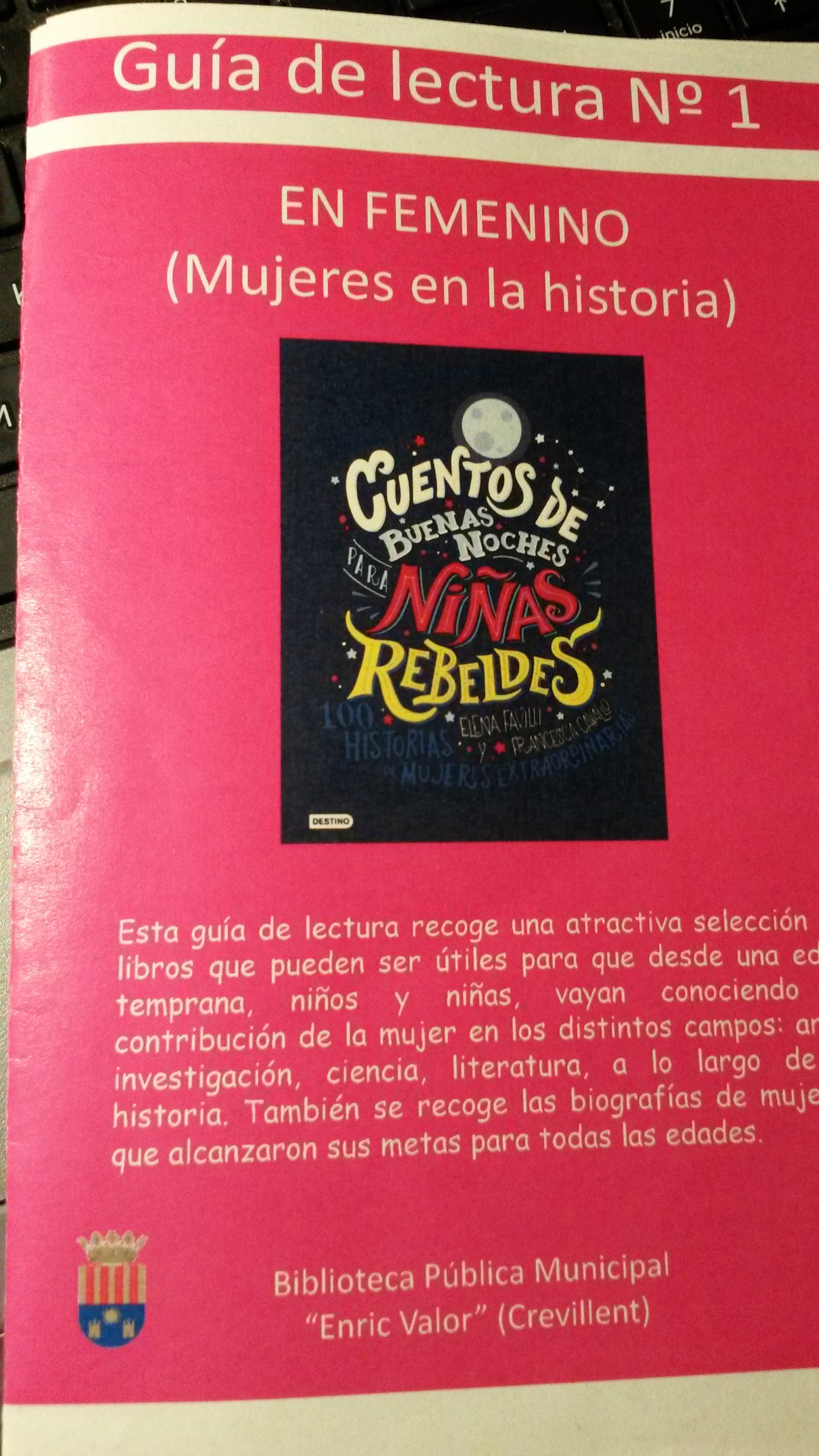 El primer ejemplar de la Guía de Lectura se ha titulado “En femenino (mujeres en la historia)” en conmemoración al 8 de marzo Día Internacional de la Mujer. La autora de la guía ha sido Raquel Agulló y la coordinadora Ana Satorre.