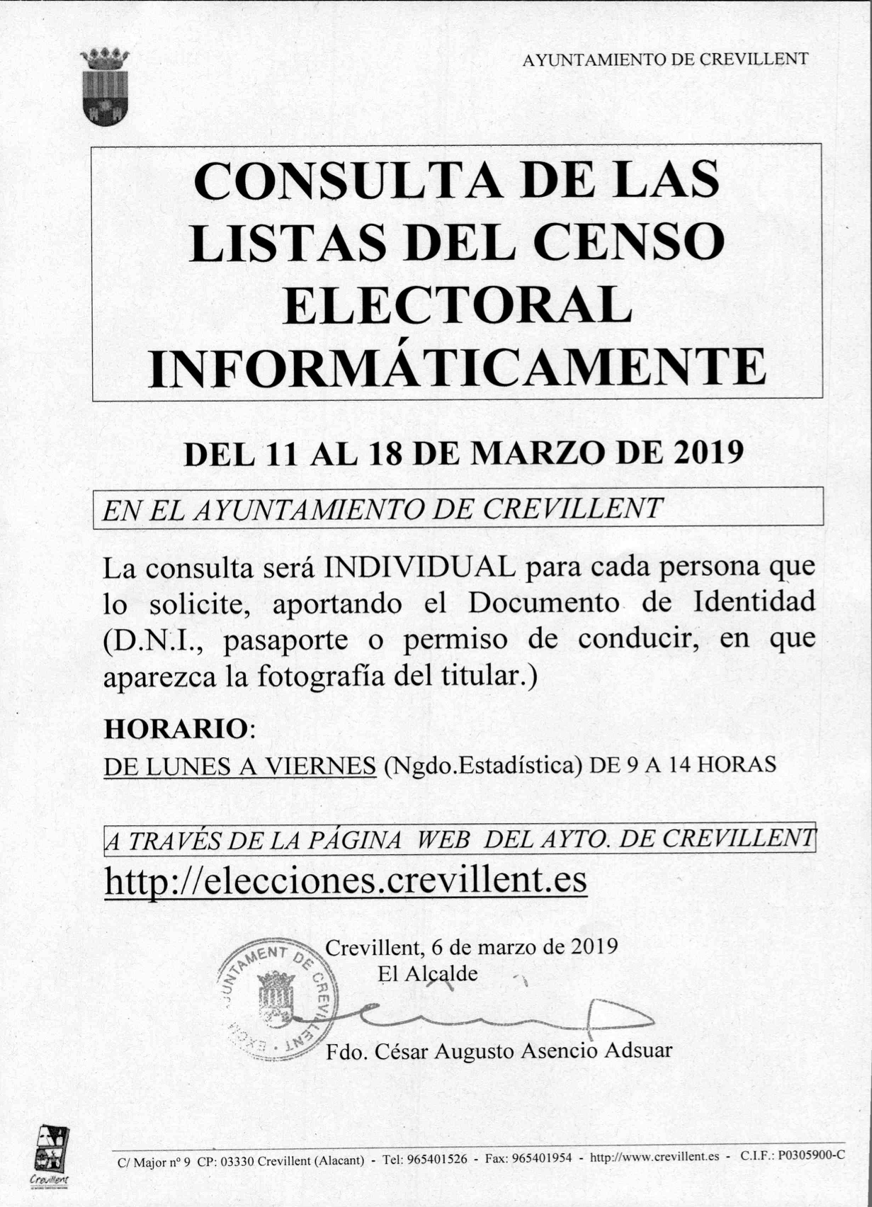 Crevillent (14/03/2019).- El Ayuntamiento de Crevillent, ante la celebración de las próximas elecciones generales y autonómicas en la Comunidad Valenciana, que tendrán lugar el próximo 28 de abril, ha puesto en marcha un nuevo servicio en su página web https://elecciones.crevillent.es/ para consultar la inscripción en el censo electoral. El censo podrá ser consultado hasta el día 18 de mazo.