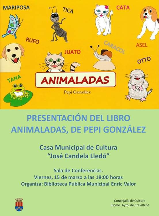 Crevillent (13/03/2019).- La Sala de Conferencias de la Casa Municipal de Cultura “José Candela Lledó” acoge este viernes, 15 de marzo, la presentación del libro “Animaladas”, de la crevillentina Pepi González.