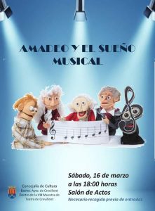 Crevillent (15/03/2019).- La Casa Municipal de Cultura “José Candela Lledó” acoge el sábado 16 de marzo la representación teatral “Amadeo y el sueño musical”, a cargo de la compañía “ENTUCOLE”. La obra se engloba dentro de la VIII Muestra de Teatro de Crevillent y dará comienzo a las 18.00 horas.