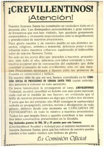 del mes de abril del Archivo Municipal “Clara Campoamor” dos impresos de la Semana Santa de Crevillent de 1942, referidos al concurso de fotografías y a la creación de la Junta de Procesiones.