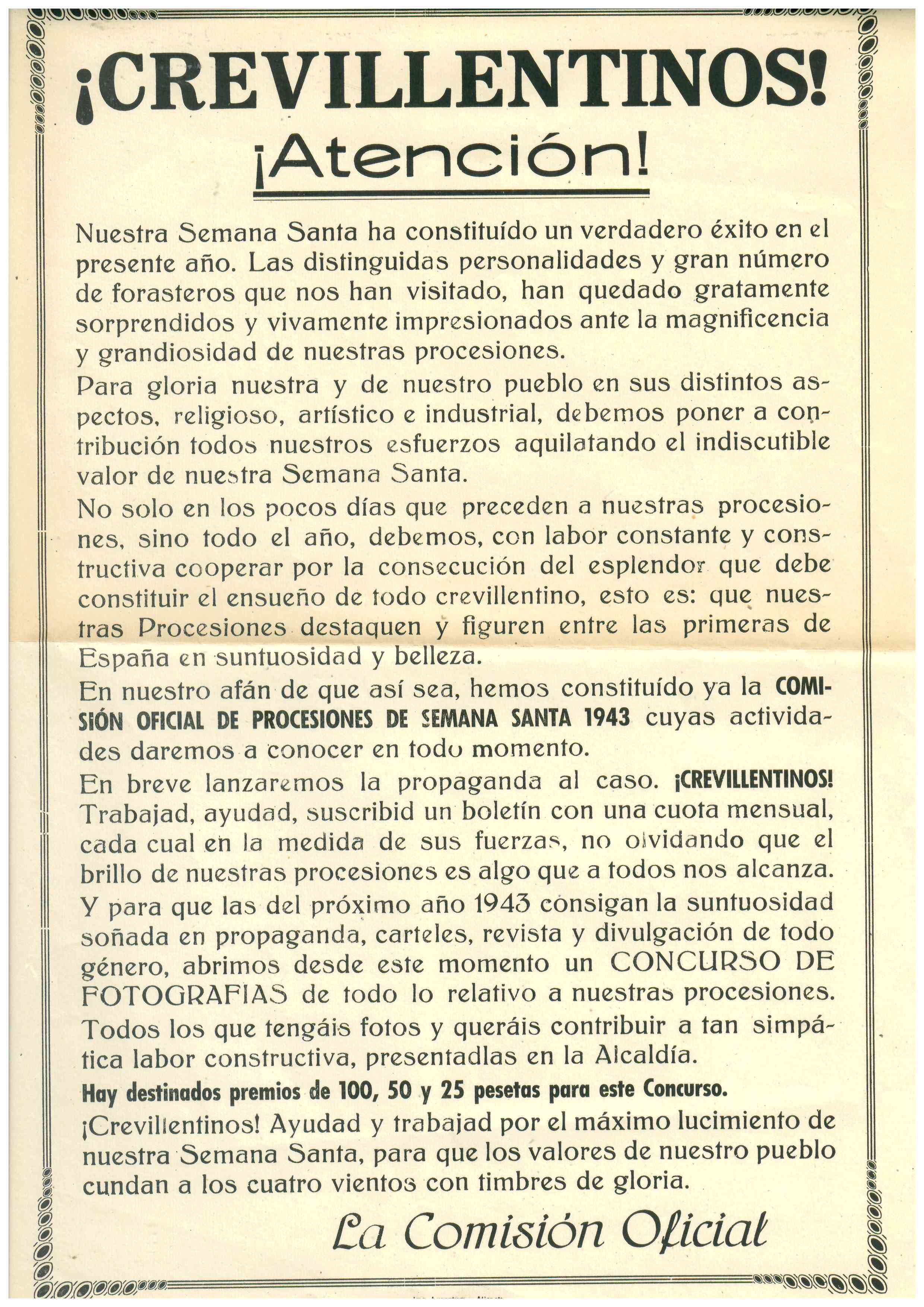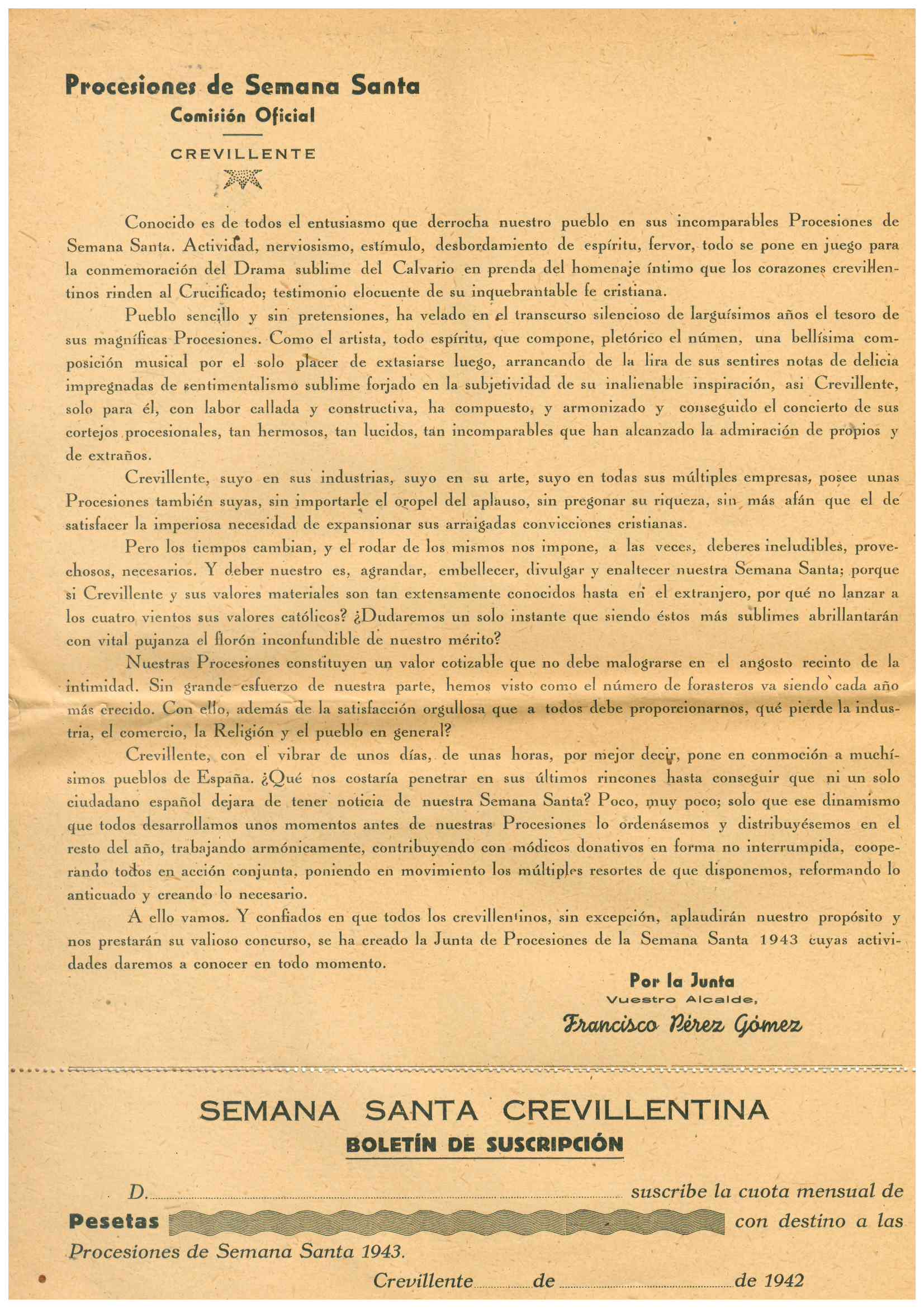 La Comisión de Festejos tenía un objetivo claro: “conseguir que ni un solo ciudadano español dejara de tener noticia de nuestra Semana Santa” y como ocurre en la actualidad se necesitan medios y por ello, se puso en marcha una campaña de suscripciones con una cuota mensual, destinadas a las procesiones de 1943.