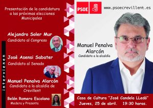 El Partido Socialista de Crevillent presenta este jueves día 25 su candidatura a las elecciones municipales de Crevillent. El acto tendrá lugar en la Casa de Cultura a las 19:30 horas y contará con la presencia e intervención de Alejandro Soler y José Asensi, ambos como candidatos al Congreso y al Senado por la provincia de Alicante, respectivamente.