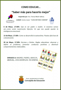 La primera charla se impartirá el 6 de mayo, a las 17.30 horas, bajo el título: “Qué es ser padre o madre. Si nosotros somos así… cómo serán nuestros hijos. En que nos puede ayudar la inteligencia emocional”.