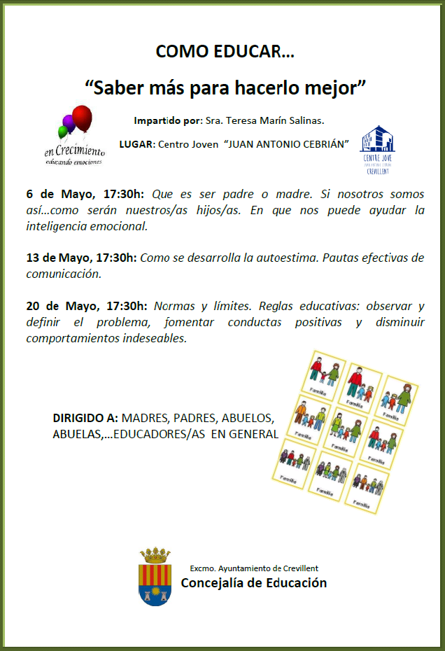 Crevillent (29/04/2019).- La Concejalía de Educación ha organizado varias charlas sobre educación con el lema “Saber más para hacerlo mejor”, a cargo de Teresa Marín Salinas. Todas las conferencias se impartirán en el Centre Jove “Juan Antonio Cebrián” y están dirigidas a padres, madres, abuelos y educadores en general.