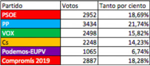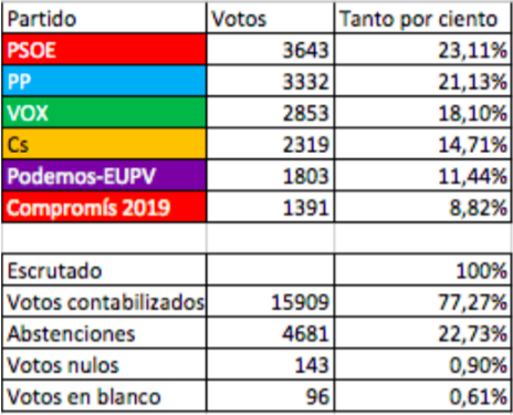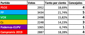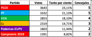 Partido Popular como vencedor de los comicios, seguido de PSOE, Compromís y VOX con el mismo número de concejales y para finalizar Cs con tres y Podemos-EUPV con un único concejal.