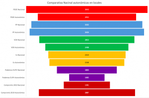 - VOX: Es un caso que bien merece un estudio pormenorizado con el paso del tiempo. La marca ha alcanzado posicionarse a nivel nacional y autonómico sin apenas propaganda electoral ni mediática. En ambos casos, los votantes la colocan por delante de Cs. Parece adecuado decir que la propaganda se la han hecho entre todos los demás partidos, lo que supone un error definitivo para los demás y una opción aprovechada por la marca.
