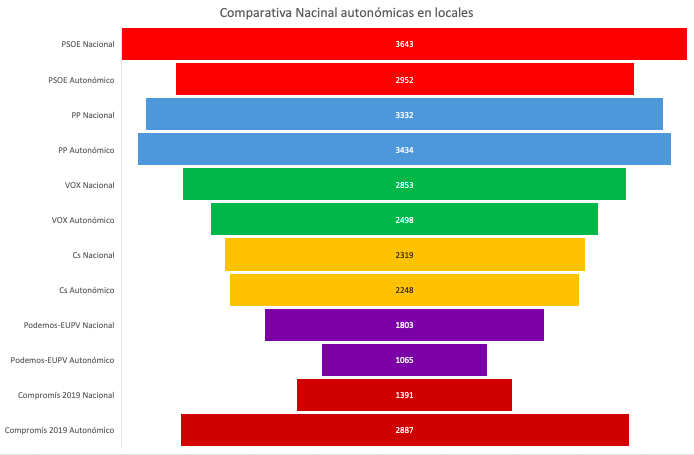 - El caso de Podemos-EUPV también es merecedor de estudio. Obtienen mejores resultados a nivel nacional que a nivel autonómico. Habría que estudiar más a fondo la posible interacción con el problema independentista. En todo caso a nivel autonómico obtiene peores resultados.