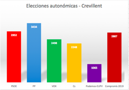 En cuanto a los votos a los partidos, la siguiente tabla nos indica las preferencias, en cuanto a las elecciones autonómicas de los crevillentinos que han votado.