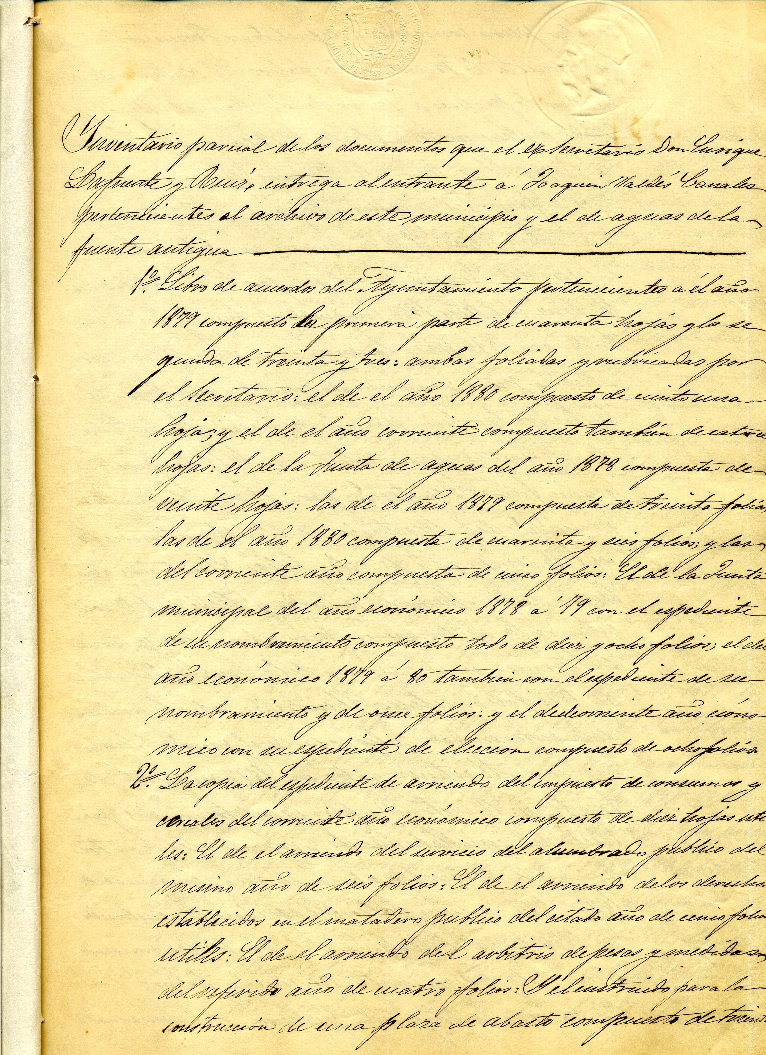 Los secretarios de los ayuntamientos estaban obligados a “custodiar y ordenar el archivo municipal donde no hubiere archivero, formando inventario de todos sus papeles y documentos”, gracias a lo cual el Archivo Municipal conserva tres inventarios de finales del siglo XIX, concretamente de los años 1881, 1895 y 1898.