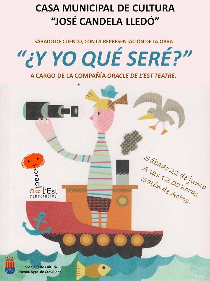Crevillent (21/06/2019).- La Casa Municipal de Cultura “José Candela Lledó” acull aquest dissabte 22 de juny l’activitat “Dissabte de Conte”, amb la representació “I jo qué seré?”, a càrrec de la companyia Oracle de l’Est Teatre. L’obra tindrà lloc a les 12 hores en la sala d’actes, sent l’entrada lliure i gratuïta.