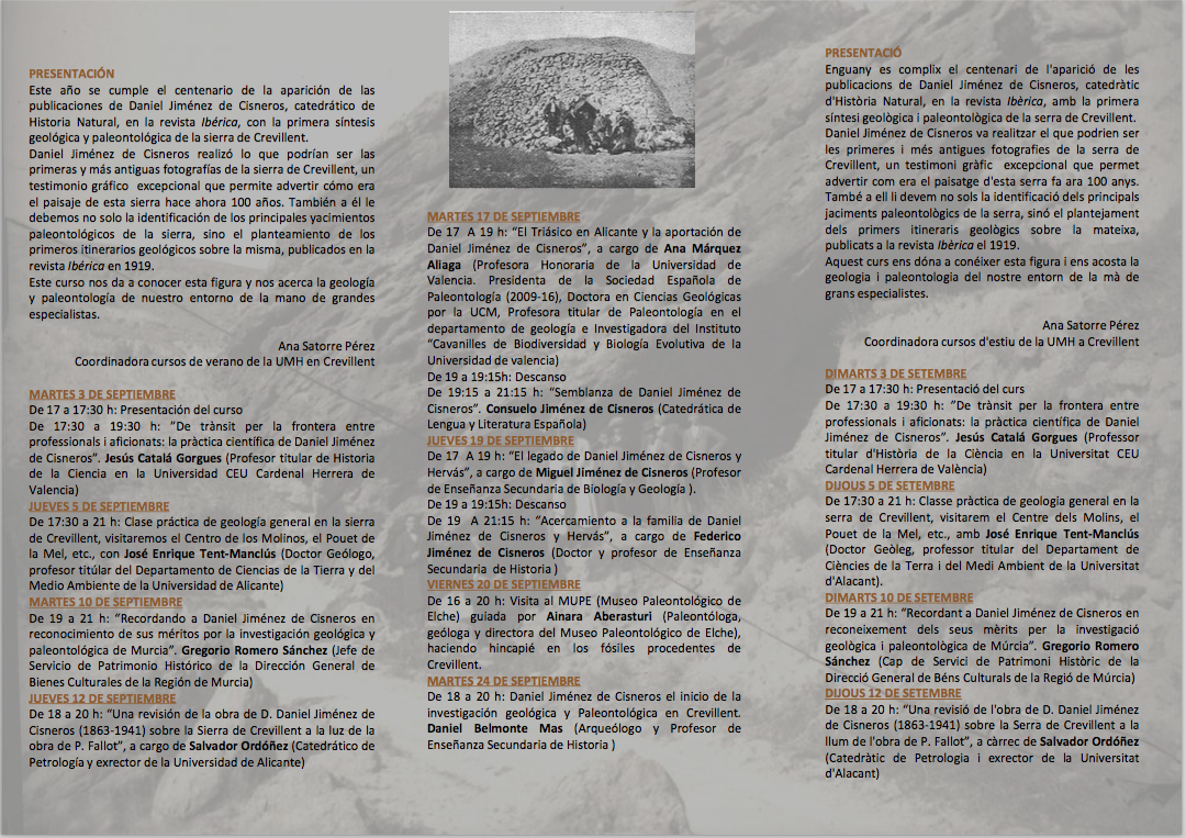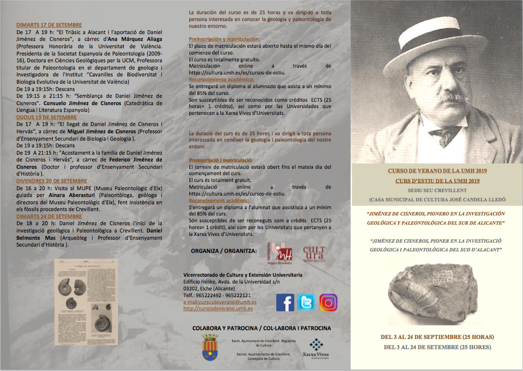 Para concluir, el martes 24 de septiembre, Daniel Belmonte Mas, uno de los organizadores y colaboradores de las actividades previstas con motivo de este centenario y que tendrán lugar a lo largo de este año, se centrará en los principales trabajos y aportaciones realizadas por Jiménez de Cisneros sobre la sierra de Crevillent. Este investigador local fue autor en 2017, junto a F. Javier Molina y Ana Satorre, de un trabajo publicado en la revista de Etnografía del Ayuntamiento de Crevillent en el que se reivindicaba la importancia de recuperar la figura de Jiménez de Cisneros, como uno de los pioneros de los estudios de Geología y Paleontología a nivel local.