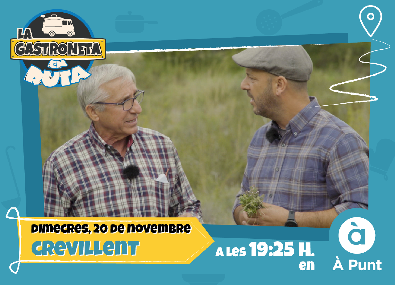 Crevillent (19/11/2019).- El canal de televisió À Punt emetrà demà, 20 de novembre a les 19.30 hores, el programa “La Gastroneta en ruta” sobre la gastronomia crevillentina. El canal valencià va comptar, en la seua visita a Crevillent, amb la col·laboració d’Ángel Candela, veí de la nostra localitat i gran coneixedor de les herbes pròpies de la Serra de Crevillent i del cuiner crevillentí Paco Pérez.
