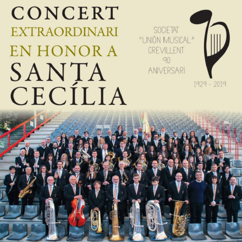El diumenge 24 de novembre serà el torn de la Societat Unió Musical de Crevillent, que celebrarà un concert a les 12.00 hores a l’Auditori de la Casa Municipal de Cultura amb motiu dels actes programats en honor a la patrona dels músics. En el seu programa s’inclouen el pasdoble Batiste de Marcos Belén Juan, El tambor de granaderos y La revoltosa de Ruperto Chapí, Danza Sinfónica de James Barnes i El camino real de Alfred Reed. La direcció de la banda estarà a càrrec de Manuel Mondéjar.