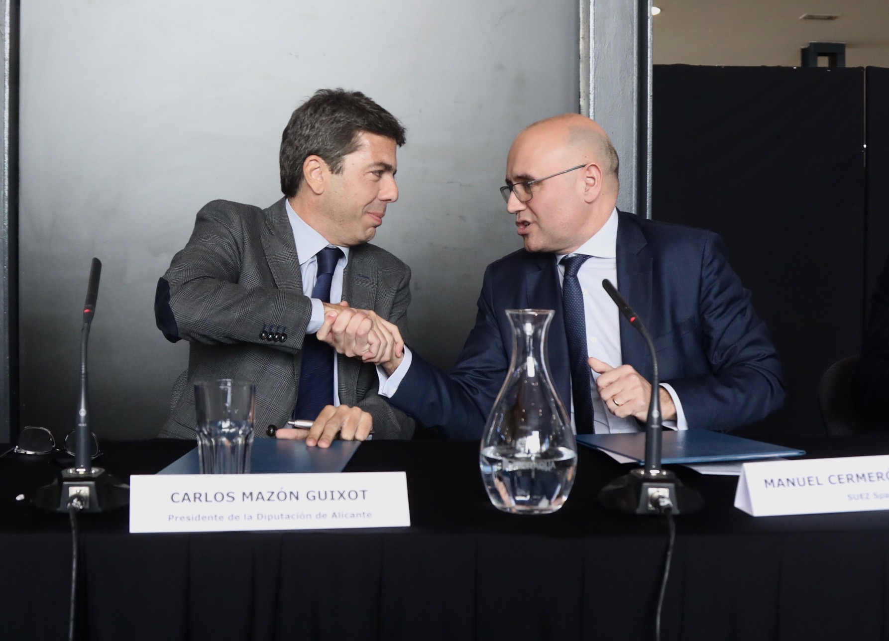 El Auditorio de la Lonja de Orihuela ha sido el lugar escogido para la rúbrica de este acuerdo por parte del presidente Carlos Mazón y el CEO de SUEZ Spain, Manuel Cermerón. El acto ha contado con la asistencia de más de medio centenar de personas, entre ellas la diputada de Ciclo Hídrico, Ana Serna, el alcalde del municipio, Emilio Bascuñana, junto a otros alcaldes de la comarca, Francisco Bartual, director general de Hidraqua – empresa del grupo SUEZ, gestora del ciclo integral del agua en 80 municipios de la provincia-, el director de Gestión Hidrológica de SUEZ Spain, Federico Ramos, y la directora general de Concesiones de este mismo grupo, Asunción Martínez.