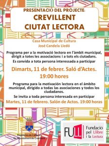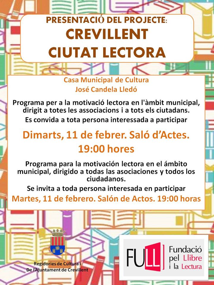 Crevillent (10/02/2020).- Crevillent presentará mañana, martes 11 de febrero, el proyecto “Ciudad Lectora” de la “Fundació pel Llibre i la Lectura”, una entidad integrada por editores, libreros, ilustradores, bibliotecarios y documentalistas de la Comunitat Valenciana y que tiene por objeto la promoción del libro y de la lectura como instrumentos de difusión y transmisión de la cultura, y como elementos de desarrollo y progreso personal y social.
