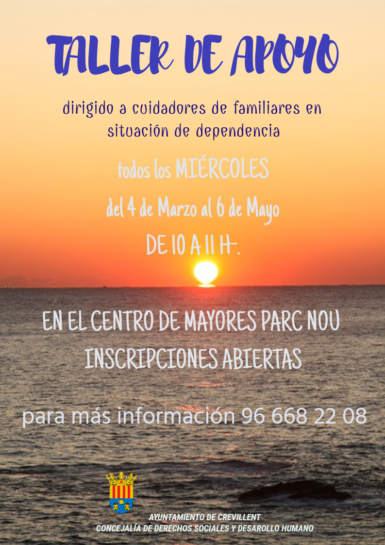 Crevillent (27/02/2020).- Ja està obert el termini d’inscripció per als tallers de suport dirigit a cuidadors/es de familiars en situació de dependència, organitzats per la Regidoria de Drets Socials i Majors de l’Ajuntament de Crevillent.