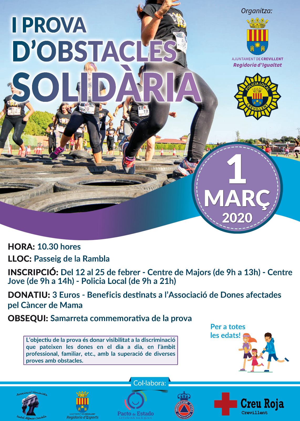 Crevillent (27/02/2020).- Vols unir-te a la lluita contra les desigualtats a les quals s’enfronten cada dia les dones? Aquest diumenge 1 de març tindrà lloc la primera Prova d’obstacles solidària de Crevillent. Aquesta activitat organitzada per la Regidoria d’Igualtat i la Policia Local començarà a La Rambla a les 10.30 hores, en diversos torns que es desenvoluparan en intervals de 20 minuts.