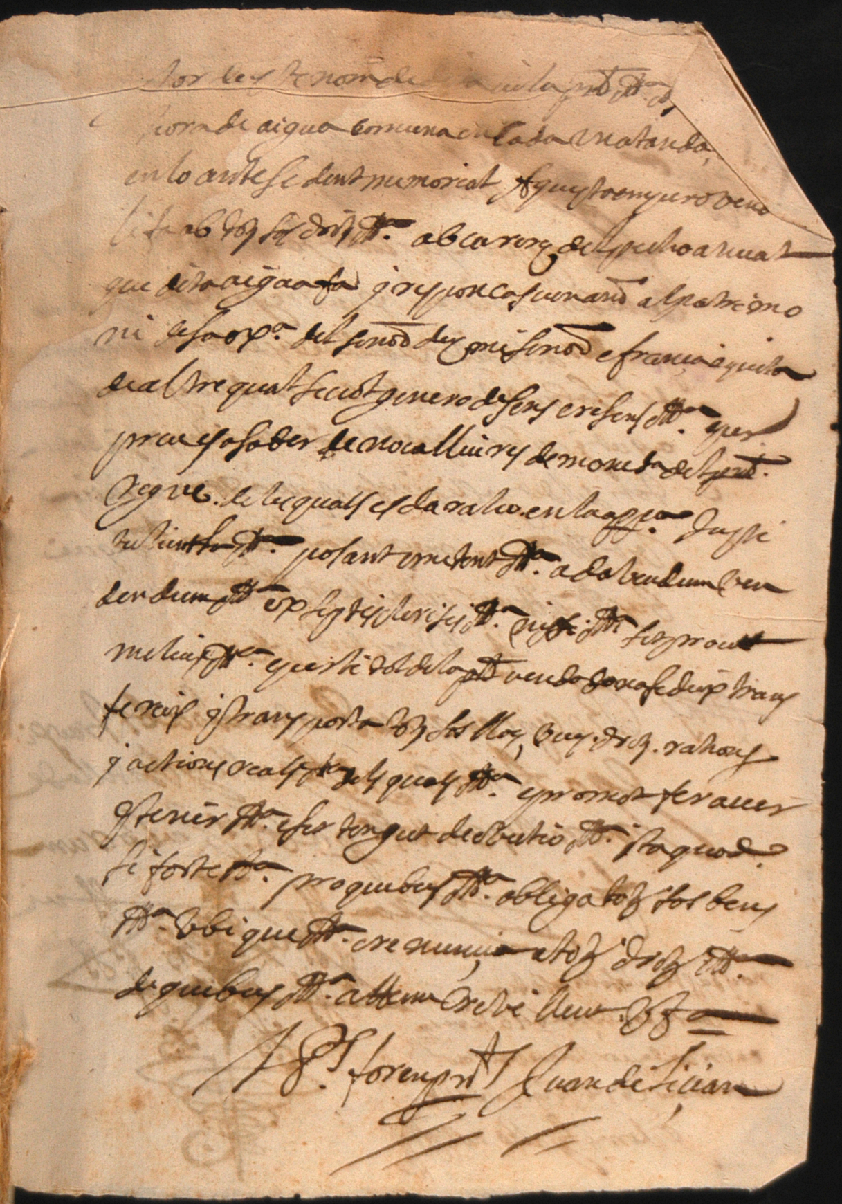 El documento escogido para este mes de marzo tiene la peculiaridad añadida de que está escrito en lengua castellana y valenciana, siendo uno de los pocos documentos en nuestra lengua vernácula. Este pleito fue presentado ante el baile de la villa de Crevillent -funcionario encargado de la administración de patrimonio del señor territorial, el duque de Cárdenas- y se incluyen las declaraciones del demandante y demandado, junto con el contrato de compraventa de una hora de agua de riego.