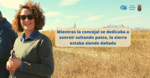 Para el Portavoz Popular, la concejal de Compromís debería estar más preocupada de la gestión de su área y lo que en ella sucede, como los recortes en más de un 30% de su presupuesto económico, que de quien asiste a las comisiones del Ayuntamiento si son los titulares o los suplentes de cada grupo político municipal. “La semana pasada, la edil de Compromís posaba plácidamente para las fotos soltando un pato en el Parque Natural del Hondo, mientras maquinaria pesada de la empresa TRAGSA arrasaba con árboles y arbustos de nuestra sierra, sin enterarse”.