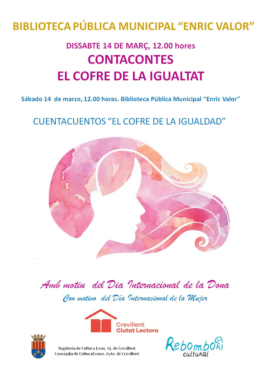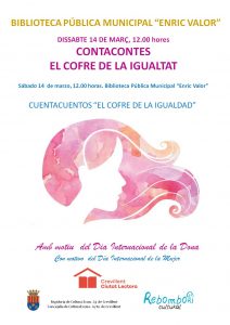Por otro lado, y con motivo de esta misma efeméride, se ha programado en la Biblioteca el cuentacuentos “El cofre de la igualtat”, a cargo de Rebombori Cultural, para el próximo sábado 14 de marzo, a las 12:00 h.
