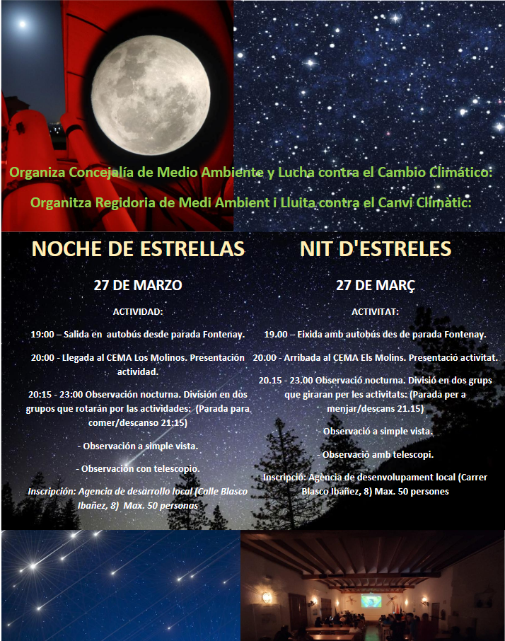 Crevillent (09/03/2020).- La Regidoria de Medi Ambient i Lluita contra el Canvi Climàtic ha organitzat la “Nit d’estreles”, una activitat que tindrà lloc divendres que ve, 27 de març, a les instal·lacions del CEMA Els Molins de Crevillent.