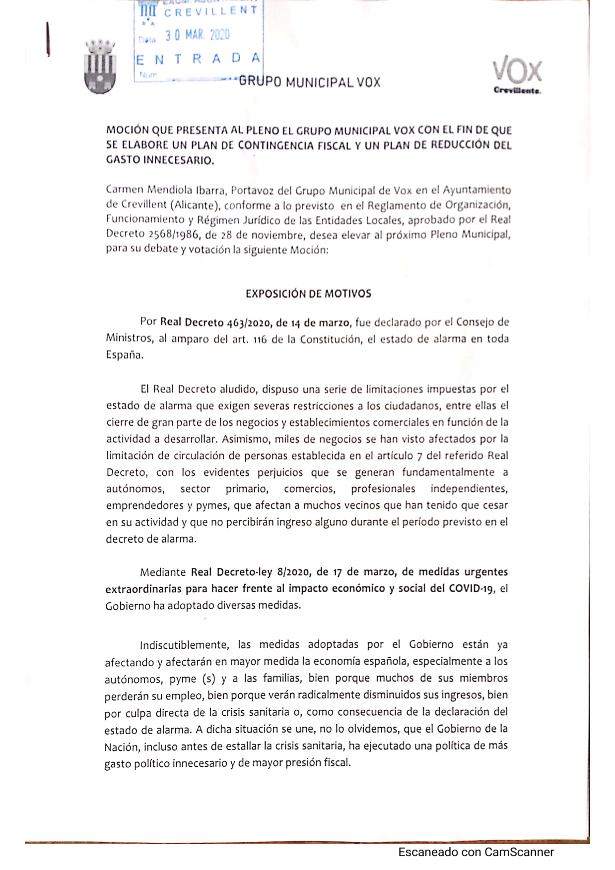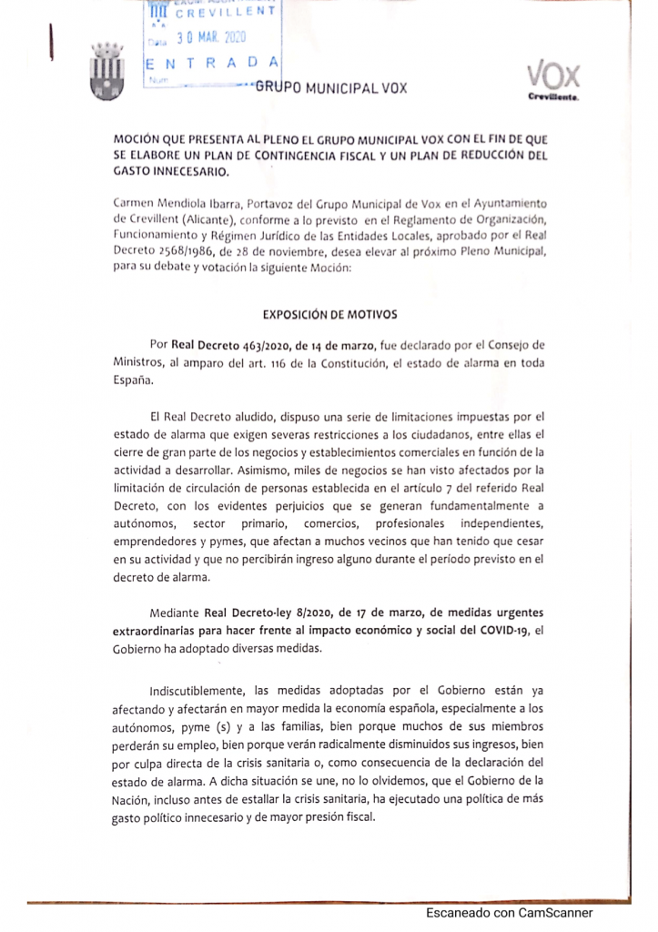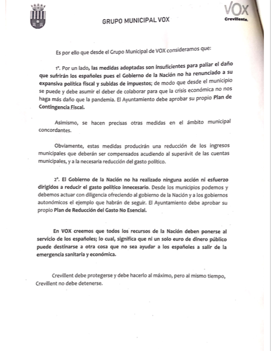 La moción consiste en medidas a tomar durante e inmediatamente después del estado de alarma; desde Vox hemos creído oportuno presentar esta moción a nivel nacional creyendo firmemente en la premisa de que todos los españoles somos iguales, e implementando por supuesto, las peculiaridades de cada uno de nuestros pueblos.