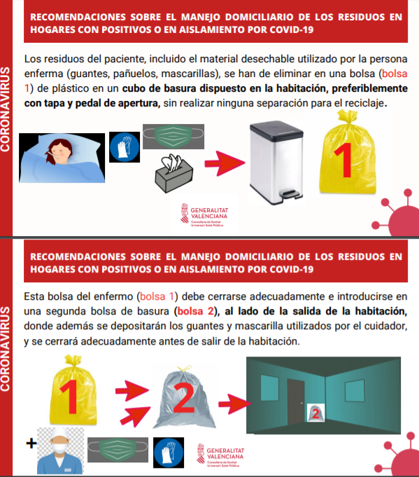 Las recomendaciones de la Generalitat basadas en las instrucciones del Ministerio de Sanidad a la hora de tirar la basura de los hogares donde haya casos positivos de COVID-19 son la siguientes: