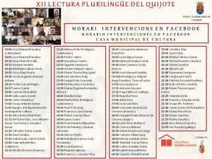 De las 86 lecturas del Quijote recibidas, encontramos intervenciones en distintos idiomas: alemán, italiano, francés, holandés, inglés, gallego, castellano y valenciano. Todas las intervenciones se han ido recibiendo en el Departamento Municipal de Cultura y han sido programadas para ser publicadas en el Facebook de la Casa Municipal de Cultura “José Candela Lledó”, desde las 10 de la mañana hasta las 22 horas, es decir que durante 12 horas se hará una lectura ininterrumpida del Quijote, apareciendo cada 5 minutos aproximadamente una grabación distinta.