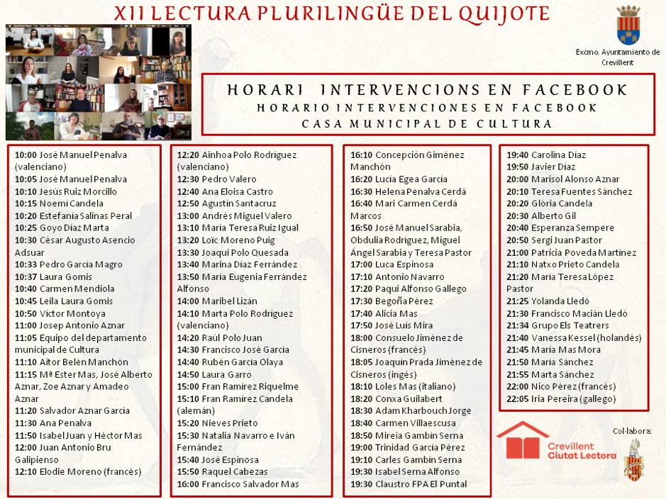 De les 86 lectures del Quixot rebudes, trobem intervencions en diferents idiomes: alemany, italià, francés, holandés, anglés, gallec, castellà i valencià. Totes les intervencions s’han anat rebent en el Departament Municipal de Cultura i han sigut programades per a ser publicades en el Facebook de la Casa Municipal de Cultura “José Candela Lledó”, des de les 10 del matí fins a les 22 hores, és a dir, que durant 12 hores es farà una lectura ininterrompuda del Quixot, i cada 5 minuts aproximadament apareixerà un enregistrament diferent.
