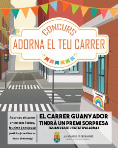L’Ajuntament anima la població a penjar des dels seus balcons garlandes i adorns, a poder ser fets amb material reciclat, i lemes d’ànim per a suportar el confinament d’una forma més positiva. Per a participar en el concurs, cal enviar les fotos dels carrers decorats al correu electrònic participa@crevillent.es abans del 10 de maig. El premi del concurs serà sorpresa i es revelarà una vegada finalitze l’estat d’alarma.