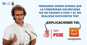 “Tras conocer que la Comunitat Valenciana no pasaba a fase 1 por no realizar suficientes test, el PP pide que el Tripartito se plante ante los líderes de sus partidos: PSOE y Compromís”