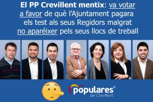Crevillent (14/05/2020).- “El Partido Popular de Crevillent apoyó la decisión de que el Ayuntamiento proporcionara los test a sus concejales y, acto seguido, criticó esta misma decisión en público a través de la prensa y sus redes sociales, escondiendo que su concejala Mari Carmen Candela acababa de votar a favor de la realización de los test pagados por el Ayuntamiento en el Comité de Salud Laboral, y a pesar de que los concejales de su grupo están en casa y no acuden a su puesto de trabajo” afirman desde el Gobierno Municipal.